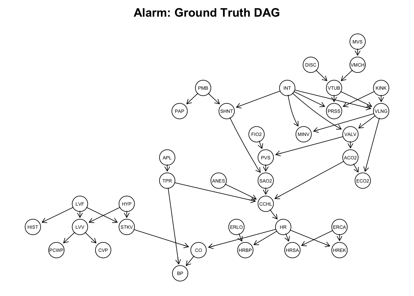 This notebook presents and applies the structure learning PC algorithm on the alarm dataset. The PC algorithm was introduced by Spirtes, Glymour, and Scheines (2000) to infer a graphical structure to a distribution. (Conditional) independencies hold in the distribution if paths in the associated graph are blocked (d-separation). The converse statement is called faithfulness. The PC algorithm starts with a complete graph and removes edges by testing (conditional) independencies. The key assumption of the PC algorithm is that all relevant and influencing variables are measures, a.k.a. ’no unmeasured confounding. Directed edges encode causality, a non-symmetric generalization of conditioning.