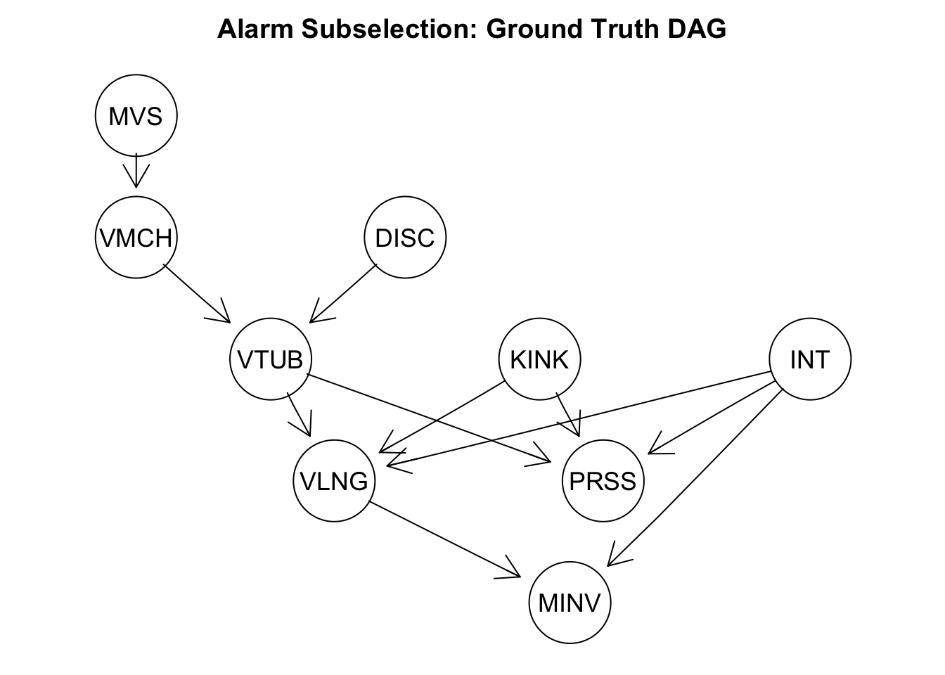 We selected the alpha value to be 0.01 as the threshold to compare p-values against. The returned CPDAG is missing the connection between “KINK” and “VLNG” but is otherwise correct. Hence, we were able to nearly recover the correct structure from 20,000 samples. Whether missing an edge or estimating an irrelevant one is worst is use-case specific. Usually however, we recommend overestimating the graph and pruning edges via auxiliary experiments in a later stage. This is specified by the alpha value, where a smaller alphas return denser graphs.