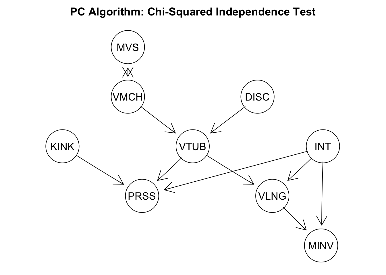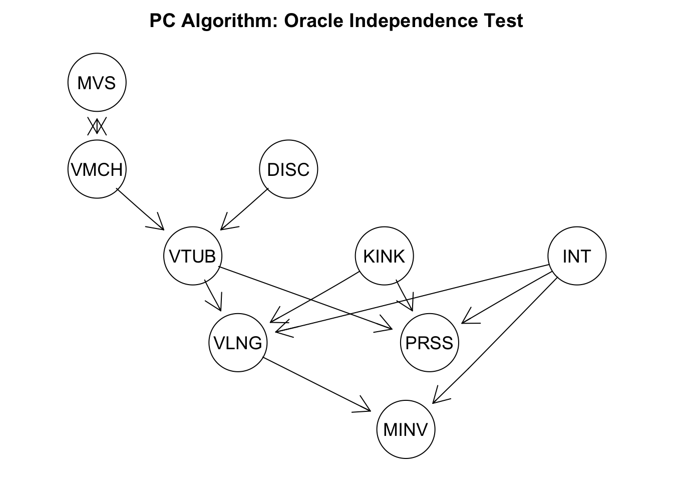 This returned CPDAG is very similar to the ground truth DAG. Only the edge between ‘MVS’ and ‘VMCH’ can not be oriented. One criterion to quantify the distance between CPDAGs is to calculate the 1-norm of the corresponding adjacency matrices.